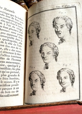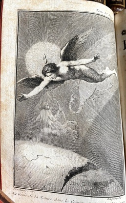 Tomo I: pp. (8), 451, (5), 2 tav. f.t.: Le Genie de la Nature dans la contemplation de l’Univers, La formation de Planetes; 2 carte geografiche ripiegate: L’Ancien Continent e Nouveau Continent.