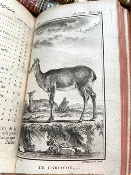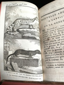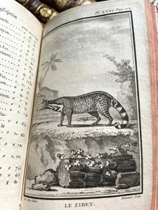 Tomo dodicesimo, 1782: pp. (10), 290, xxxviij, (2). Tav. da XXX a XLIX (continua la numerazione dal volume precedente). Le Chevrotain appelé petite Gazelle, Le Cochon de terre, Du Raton-crabier, Du Coati, Du Sarigue, De la Marmose...