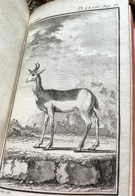 Tomo venticinquesimo: (8), 270, (2). Tav. da XXIII a LVII (continua la numerazione dal volume precedente). Le Bubale et les autres animaux que ont rapport aux Gazelles et aux Chèvres, Le Condoma, Le Guib, La Grimme, Les Chevrotains, Les Mazames...