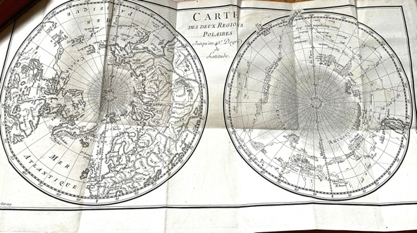 Tomo decimo, 1778: pp. (4), v (1), 372, xliv, (2). Tav. VI f.t. ed una grande carta ripiegata: Carte des deux Regions Polaires Jusqu’au 45’ Degré de Latitude. Reduite et gravée par Aldring.