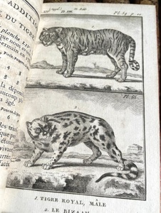 Tomo diciannovesimo: (6), 227, (3), tav. da XVIII a XLI (continua la numerazione dal volume precedente). Le Jaguar, Le Couguar, Le Lynx, Le Caracal, L’Hyoene, La Civette& Le Zibet...