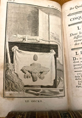Tomo secondo, 1788: pp. (4), 462, (2). Tav. XV f.t. Le Lezard-gris, Le Lezard-vert, Le Cordyle, La Salamandre, Le Dragon, Le Gecko, Le Geckotte...