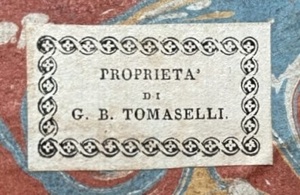 Ex libris G. B. Tomaselli (Modena, 1763 –Modena, 1833): Sacerdote e professore universitario di fisica sperimentale a Modena. Fu precettore (risulta tra i servitori di casa Canova a Roma ed è ricordato nel testamento dello scultore del 1802 come “mio lettore e familiare”) e in seguito divenne professore di filosofia e matematica elementare al Collegio dei Nobili di Modena. Nel 1798 fu supplente delle stesse discipline all’Università. Nel 1800 gli furono affidate le cattedre di istituzioni filosofiche e fisica sperimentale rimaste vacanti quando Giovanni Battista Venturi passò all’Università di Pavia. Gestì il teatro fisico dell’Università. (G. Tiraboschi, Notizie biografiche, etc, Tomo III, 1835).