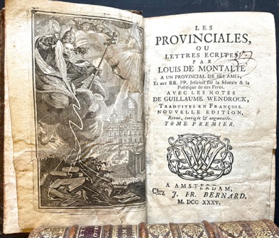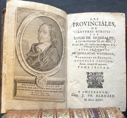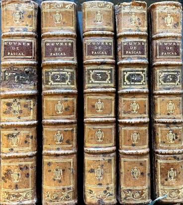 Importante edizione, preceduta da note sulla vita di Pascal di Nicole e del curatore, i primi due volumi contengono le Lettere Provinciali e i Pensieri. "I Pensieri, in questa edizione", afferma il curatore, "sono arricchiti non solo da un gran numero di pensieri, ma anche da diversi pezzi molto consistenti che non erano mai stati stampati" (Quérard). Il volume III contiene opere attribuite a Pascal su argomenti ecclesiastici; i volumi IV e V raccolgono le sue opere matematiche.