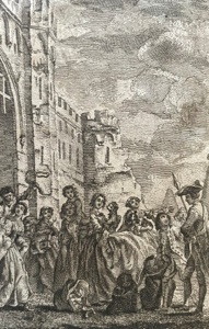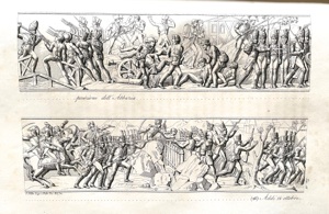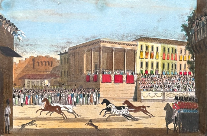 Incisione a colori dell’Ottocento (acquatinta) che raffigura il Palio dei Barberi a Firenze.