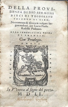 Della Provvidenza di Dio Sermoni dieci dei TEODORETO Vescovo di Ciro . Nuovamente di Greca in volgare lingua tradotti per Lucio Paolo Rosello Padovano. Alla Serenissima Reina di Francia.