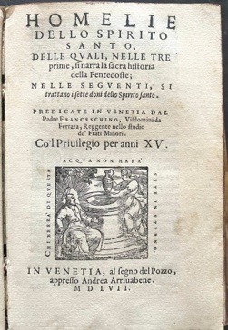 Homelie dello Spirito Santo delle quali nelle tre prime, si narra la sacra historia della Pentecoste. Nelle seguenti si trattano i sette doni dello Spirito Santo. Predicate in Venetia dal Padre Franceschino Visdomini da Ferrara, Reggente nello Studio de’ Frati minori.