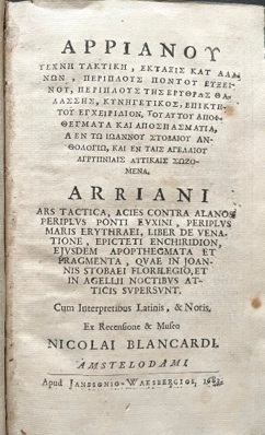 Senza dubbio una delle migliori edizioni degli scritti di Arriano, annotata da Blancardi e contenente numerosi commenti di Meric Casaubon, Jusus Lipsius, Angelo Politan, Lucas Holstein, ecc.