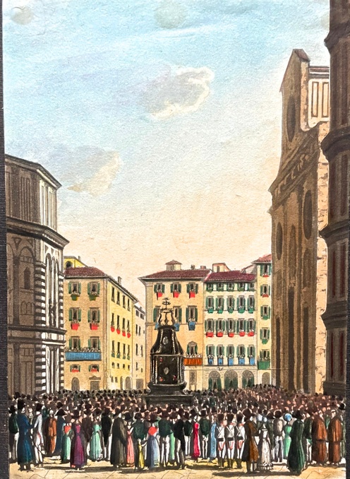 Incisione (acquatinta) a colori dell’Ottocento (cm. 17,5x12,5) raffigurante lo Scoppio del Carro, una tradizione storica fiorentina che si svolge ogni anno la mattina della Domenica di Pasqua in Piazza del Duomo a Firenze. La cerimonia ha origine ai tempi della Prima Crociata, quando un fiorentino di nome Pazzino de’ Pazzi riportò a Firenze alcune pietre del Santo Sepolcro di Cristo. Queste pietre vengono usate per accendere il fuoco sacro che a sua volta accende un razzo a forma di Colomba, chiamato “COLOMBINA”, che scivolando lungo un filo, raggiunge un carro pirotecnico, noto come Brindellone, e innesca uno spettacolo di fuochi di artificio. € 140