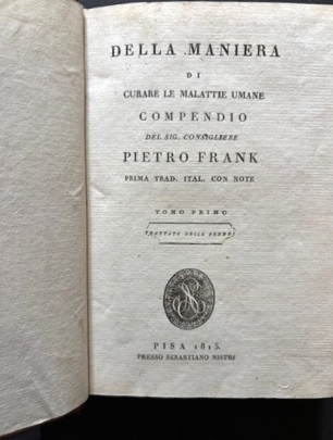 Della maniera di curare le malattie umane. Compendio del Sig. Consigliere Pietro Frank. Prima traduzione italiana con note del Signore Dottore Ranieri Comandoli, Medico al servizio di S.A.I. e R. il Granduca di Toscana pel Dipartimento de’ beni della Corona in Pisa e Medico di turno del R. Spedale di detta città.