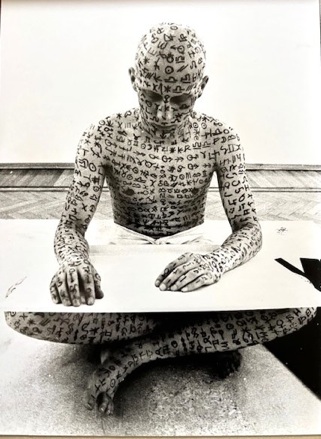 Il quadro spettacolo di cui scrive Claudio Parmiggiani nella lettera era incentrato sulla figura di un giovane uomo sul cui corpo Parmiggiani nella Galleria milanese dipinse dei segni alchemici o astrologici tratti da un antico alfabeto; l'idea alla base del progetto era quello di proiettare la scrittura sullo scrittore in una relazione tra segno parola e immagine definita dal processo artistico.