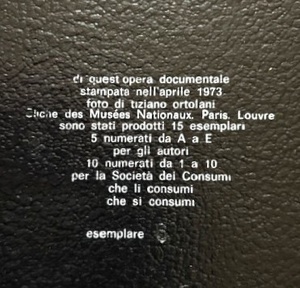 Colophon: di quest’opera stampata nell’aprile 1973, foto di Tiziano Ortolani, cliche des Musées Nationaux Paris Louvre sono stati prodotti 15 esemplari 5 numerati da A a E per gli autori 10 numerati da 1 a 10 per la Società dei Consumi che li consumi e che si consumi.