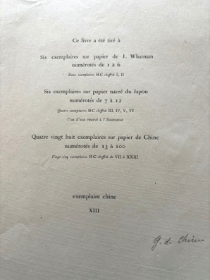 Per Calligrammes, edizione a tiratura limitata di cui il nostro esemplare è uno di quelli stampati su papier de Chine, Gallimard affidò la composizione dei testi al tipografo Maurice Darantière, che utilizzò caratteri Garamond in maiuscolo lapidario e in corsivo, inchiostrati in nero e rosso. A de Chirico propose di cimentarsi, attraverso la tecnica a quella data per lui quasi inedita della litografia, in una sfida giocata sul filo del paradosso: nei calligrammi di Apollinaire il rapporto tra testo e immagine si risolve in ambito tipografico, mentre le litografie dell’artista spostarono in altra direzione quell’equilibrio, per via del timbro onirico dell’invenzione iconografica e della sinuosità del ductus lineare, «[…] dove neri assoluti spiccano su grigi argentei», come notava Lamberto Vitali già nel 1931.