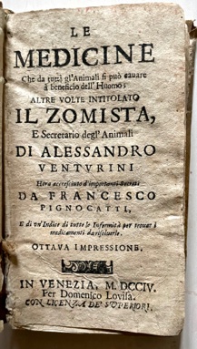 Le Medicine che da tutti gl’Animali si può cavare à beneficio dell’Huomo; altre volte intitolato il Zomista, e Secretario degl’Animali di Alessandro Venturini, hora accresciuto d’importanti secreti da Francesco Pignocatti, e di un Indice di tutte le Infermità per trovar i medicamenti da risolverle.