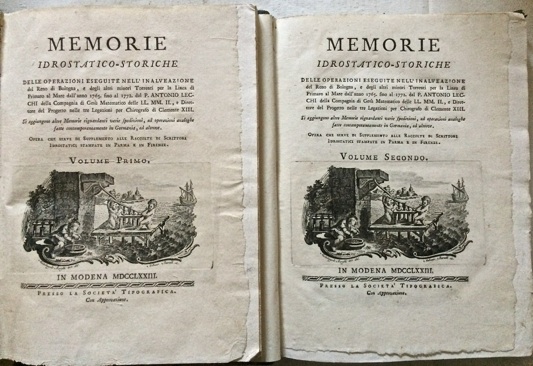 Memorie Idrostatico - Storiche delle operazioni eseguite nell’inalveazione del Reno di Bologna, e degli altri minori torrenti per la linea di primaro al Mare dall’anno 1765 fino al 1772 dal P. Antonio Lecchi della Compagnia di Gesù Matematico delle LL. MM. II. , e Direttore del progetto nelle tre Legazioni per Chirografo di Clemente XIII.