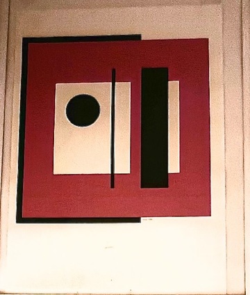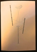 Cm. 15,2 x60. Quattro quadrati ripiegati con fori circolari con diametro differente ed appeso un dischetto metallico color oro. € 500