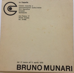 Pieghevole di cm. 15 (aperto cm. 45,5). Martedì 17 marzo alle ore 21 Bruno Munari presenterà diapositive e film di sua produzione. Mostra personale di Bruno Munari alla Galleria La Cappella, Centro ricerche e sperimentazioni audio/visive, Arti figurative, Cinema, Spettacolo, Trieste.